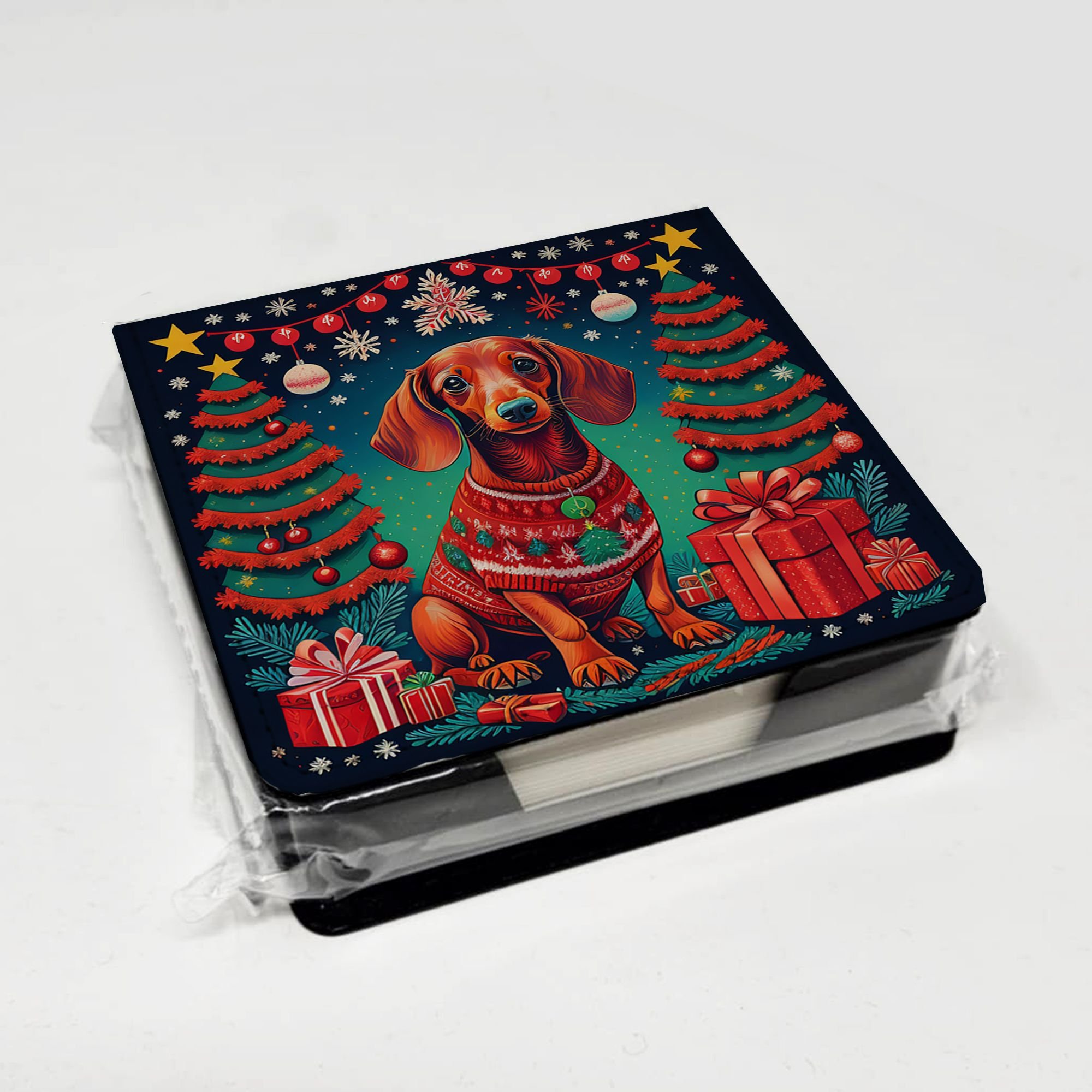 PU Leather Note Paper Holder featuring breed specific Dachshund artwork. Celebrate Christmas with this Christmas Note Paper Holder. Elevate your workspace with this PU Leather Note Paper Holder, crafted to resemble luxurious leather without the use of animal products. Made from durable synthetic PU leather, it offers both a premium look and eco-friendly appeal. This note holder, compactly sized at 4.25 x 4.25 x 1.25 inches, includes about 160 sheets of 3.75 x 3.75-inch note paper—ideal for quick notes and reminders. An exclusive artist-designed cover makes each holder uniquely vibrant, adding a splash of color and personality to any desk or office. The discrete design keeps note paper hidden, maintaining a neat and organized workspace. Perfect as a gift or for personal use, this stylish holder is refillable with standard paper, ensuring long-lasting utility. A must-have for anyone seeking a sophisticated, artful touch to their workspace while supporting animal-friendly products. Add style, organization, and creativity to your everyday routine with this elegant note paper holder.