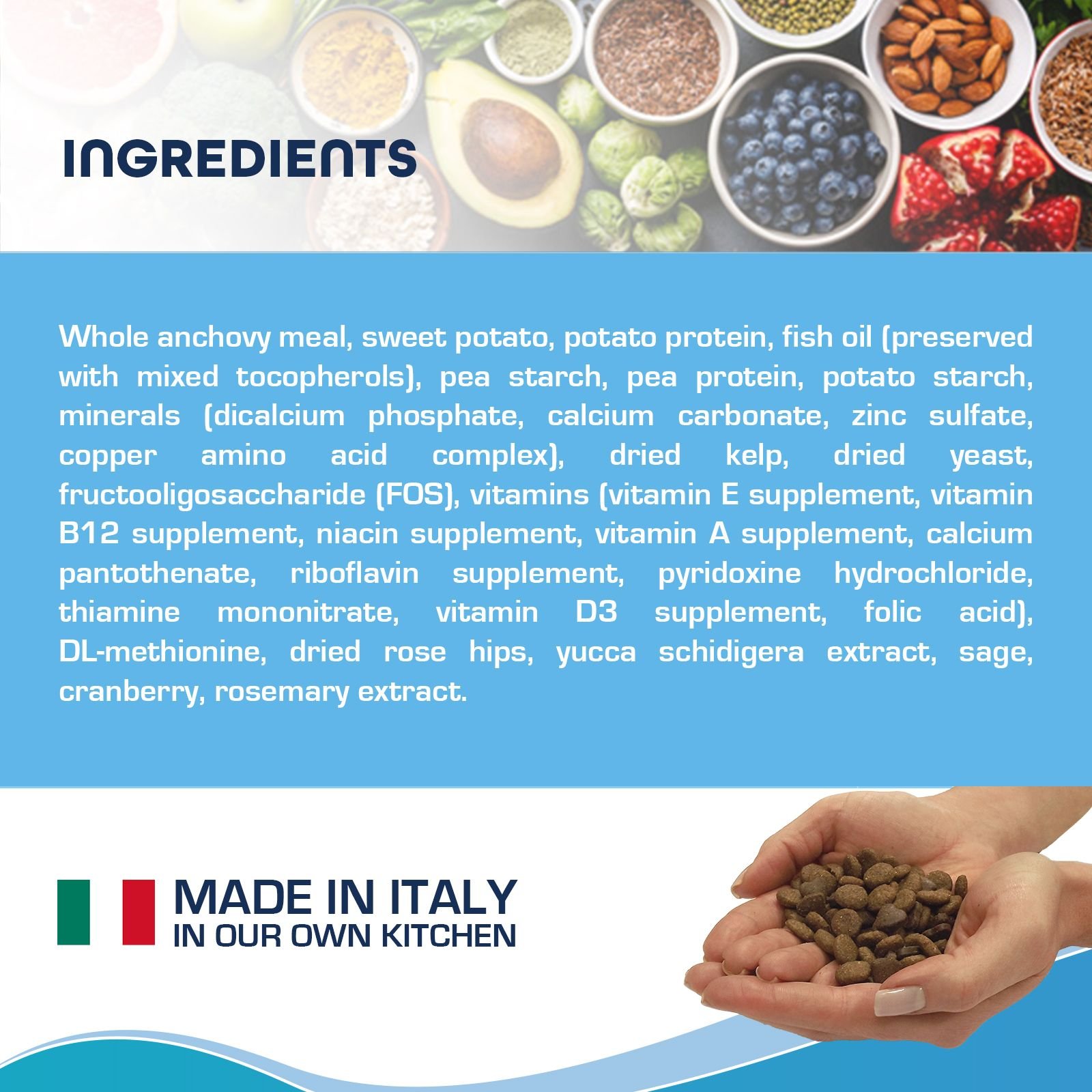 Whole anchovy meal, sweet potato, potato protein, fish oil (preserved with mixed tocopherols), pea starch, pea protein, potato starch, minerals (dicalcium phosphate, calcium carbonate, zinc sulfate, copper amino acid complex), dried kelp, dried yeast, fructooligosaccharide (FOS), vitamins (vitamin E supplement, vitamin B12 supplement, niacin supplement, vitamin A supplement, calcium pantothenate, riboflavin supplement, pyridoxine hydrochloride, thiamine mononitrate, vitamin D3 supplement, folic acid), DL-methionine, dried rose hips, yucca schidigera extract, sage, cranberry, rosemary extract.