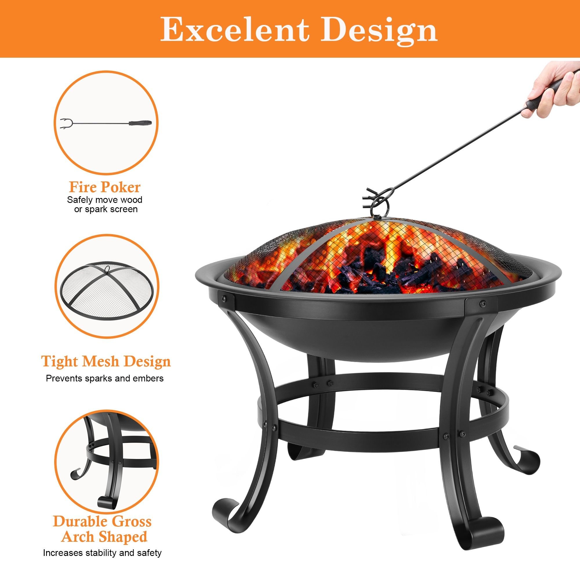 Home > Outdoor 22 Inch Round Fire Pit, 5 Piece Set, Curved Iron Outdoor Wood Burning Fire Pit Terrace BBQ Camping Fire Pit with BBQ Backyard Poolside, Black