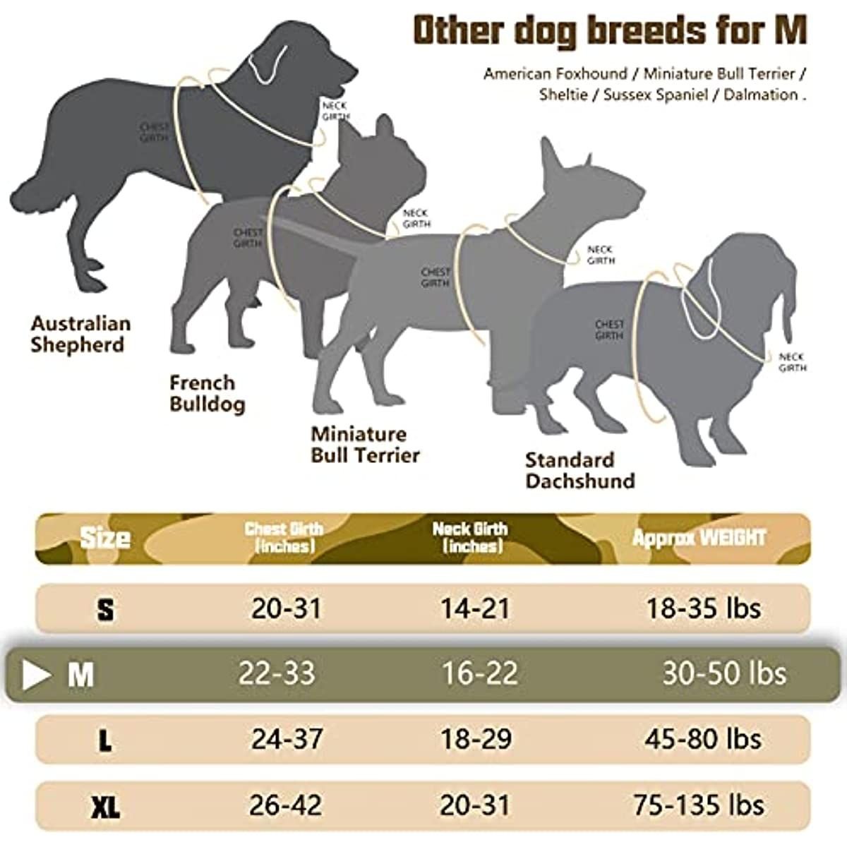 EASY ADJUSTMENT: Put on and take off this product with 2 quick-release buckles with no hassle. 4 fully adjustable straps (2 Shoulder and 2 Chest) allow a snug fit with maximum mobility. DURABLE MATERIAL: Our heavy duty vest made of 900D Nylon with sturdy stitching for extra durability; suitable for all fields use. Two rings can bear great pulling force ; ensuring your dog is safe during training; hunting; working; and any other occasions. Well padded in every pressure load point to protect your dog's skin; while the breathable air mesh keeps your dog comfortable. Molle System Use: Two 1" strips of Molle Sewn on both sides; allow your dog to carry gear in training. A wide range of use for personal service; law enforcement; hunting; or outdoor recreation. (Included ID Badge - BEST FRIEND ). It compatibles with Molle /PALs Pouch; so you can also hook dog bowl; water bottle and toys(No included). MAXIMUM CONTROL & SECURITY: Our safety harness features 2 metal leash attachment points to dog walks safely - One front clip for No-pull control or dog training; and the other one back clip for casual walking or jogging. SATISFACTION WARRANTY: Please reference to the sizing chart. Against any quality issues - Feel free to contact us if you have any questions; we are always here to help
