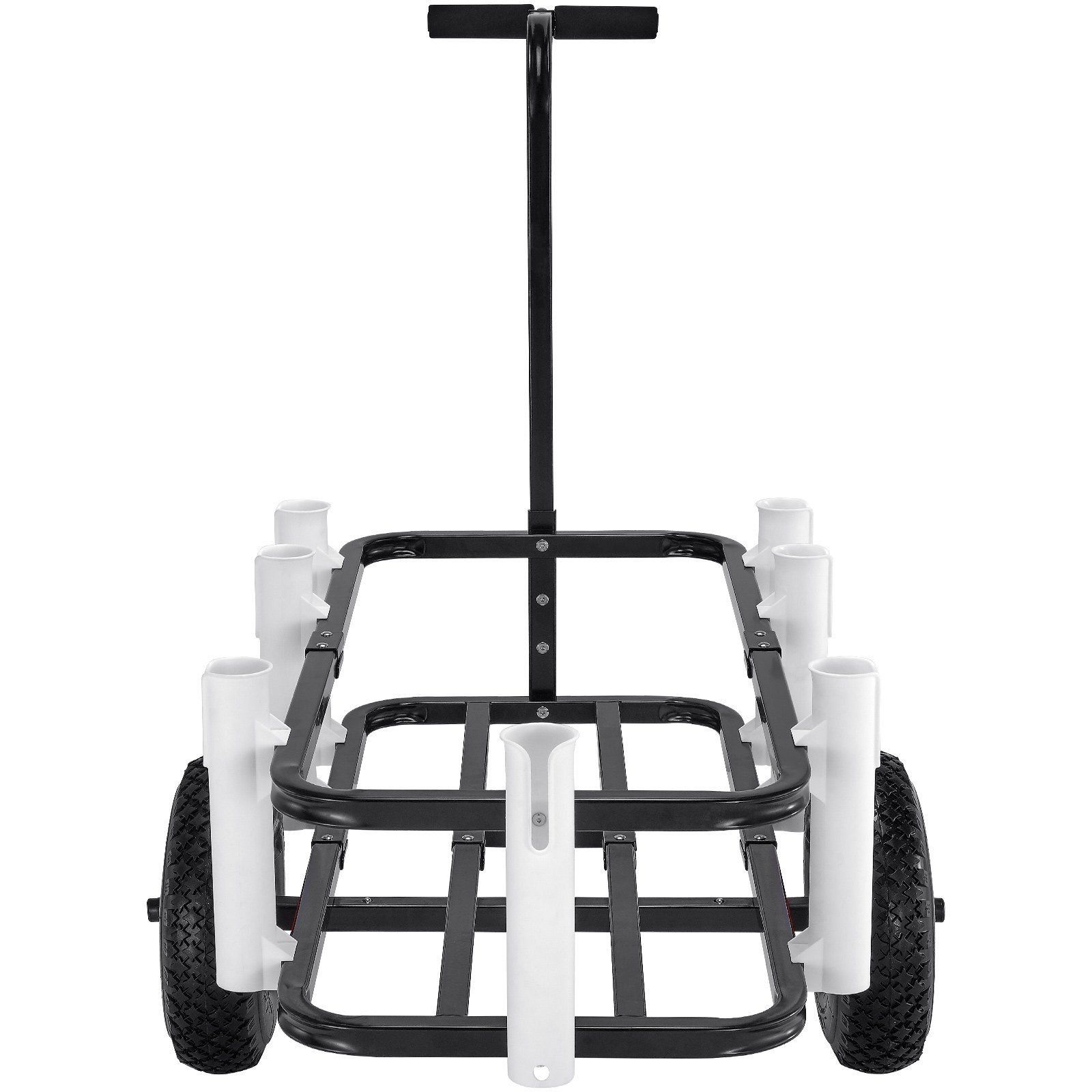 Picture this: a fishing cart with a solid steel frame, rolling smoothly on 11-inch rubber inflatable wheels. Sized at 34 x 14.5 x 7 inches and ready to carry up to 200 lbs with 7 rod holders, it's your perfect partner for fishing adventures.