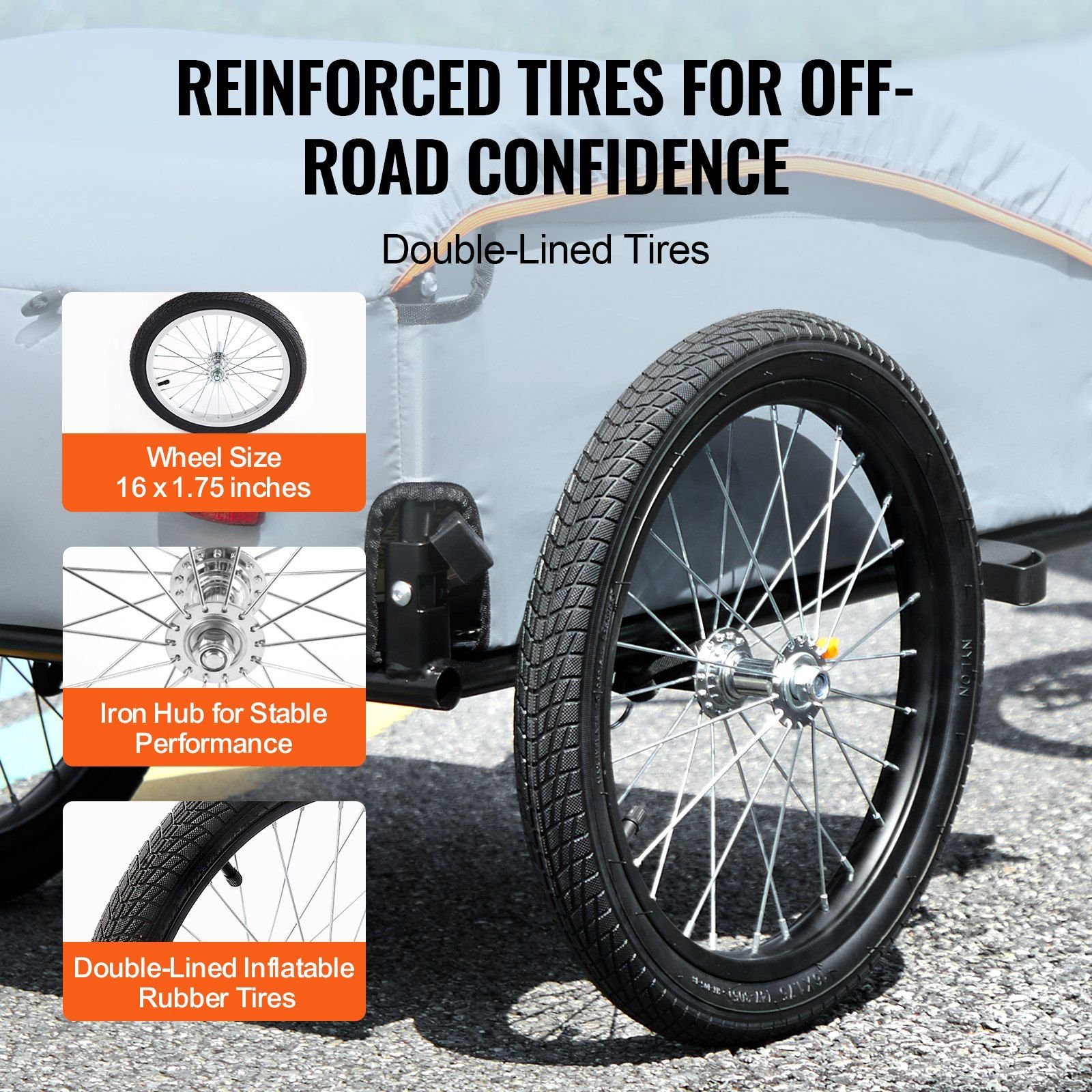 3.Professional Tire Design: Roll smoothly on any road! Our bike trailer comes equipped with sporty 16" x 1.75" tires and iron hubs, providing excellent stability and traction on various surfaces, whether you're cruising on concrete, navigating gravel paths, or tackling sandy trails.
