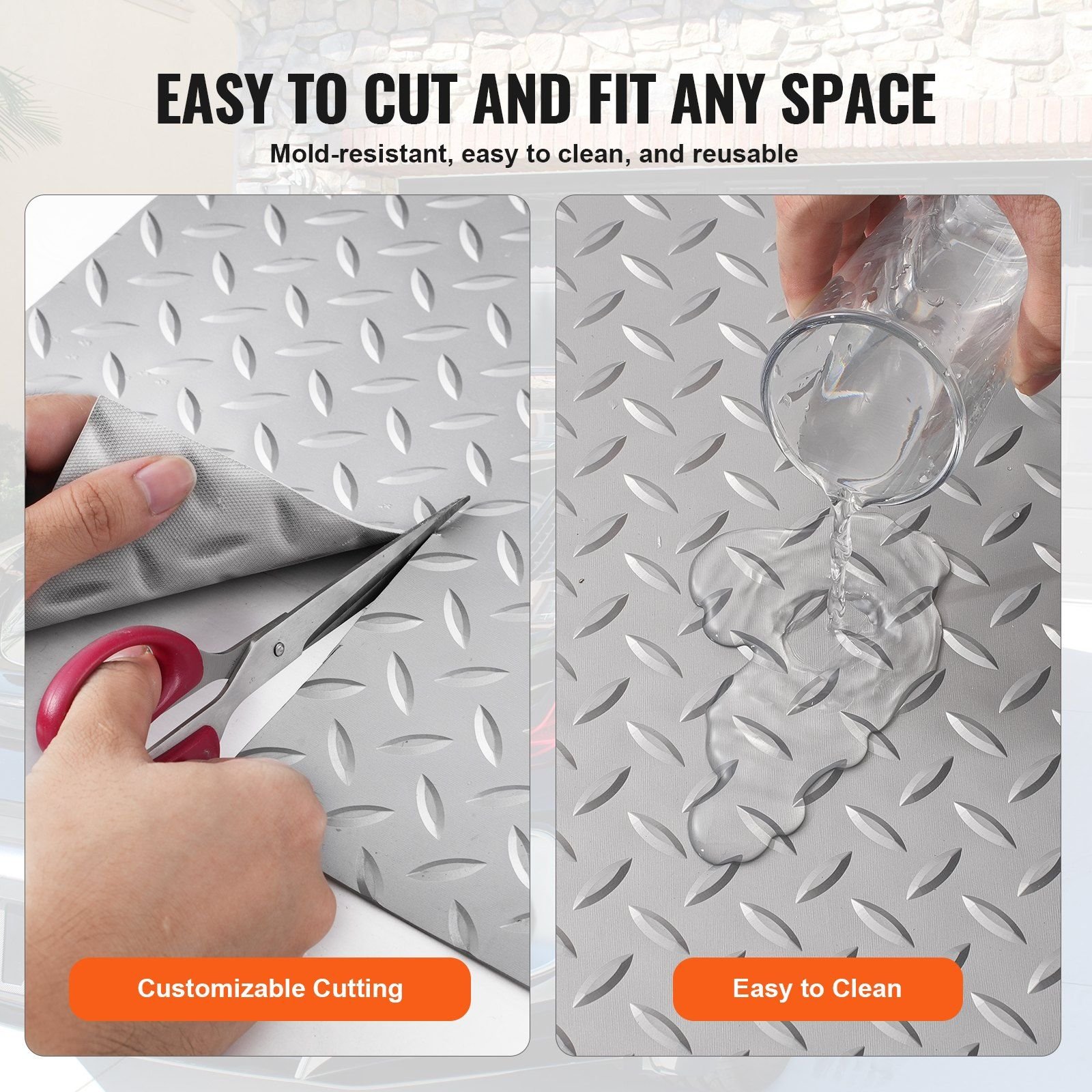 4.Easy to Clean and Cut: Easily trim the mat to fit your specific needs and ensure a perfect fit for any space. Plus, our diamond garage floor mat is easy to clean, quickly restoring its pristine condition even in heavily soiled environments, making it reusable.