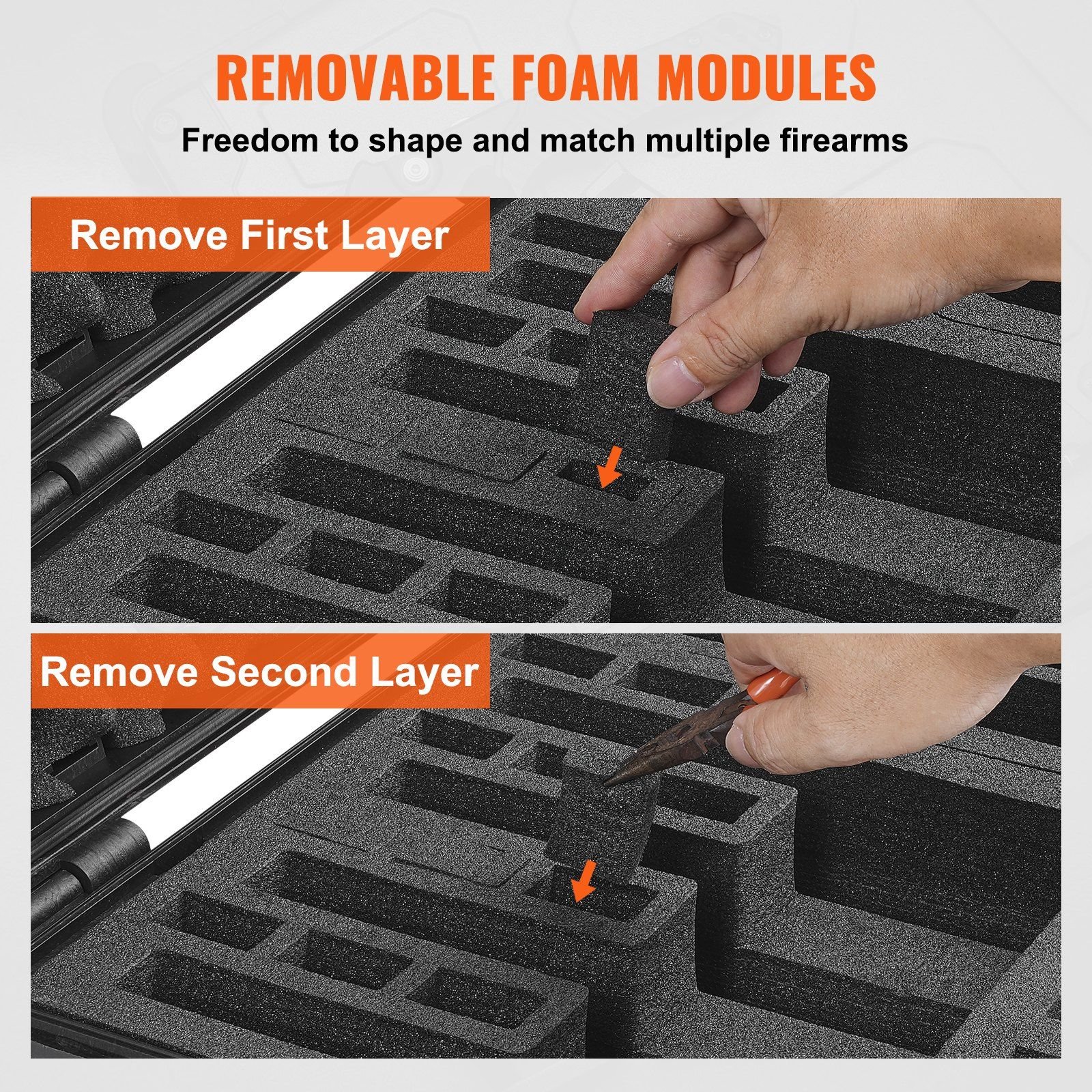 3.Versatile XPE Module: To ensure a precise fit with handguns of various sizes, we've integrated height and length adjustable XPE modules. This feature ensures that even the smallest handguns fit snugly like full-sized ones, making it perfect for storing most handgun models and accessories such as goggles, holsters, gloves, and ammunition, offering an ideal storage and travel solution.