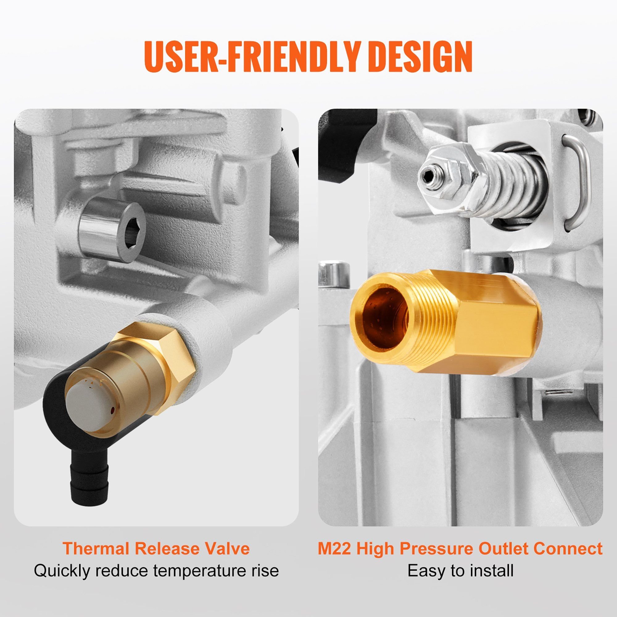Our replacement power washer pump has a thermal release valve for safe use. Once the internal temperature of the pump head exceeds 58℃, it will automatically turn on to cool down.
