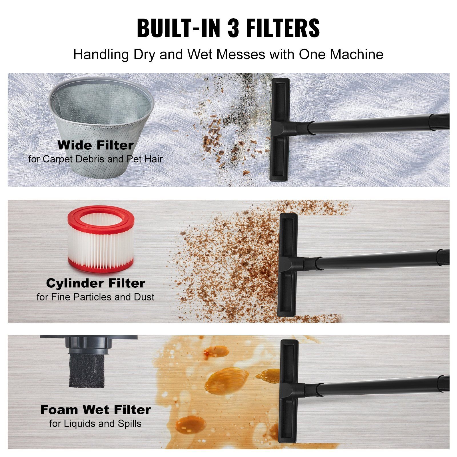 2.Efficient Filters: Equipped with three types of filters designed for specific cleaning needs, from floors and carpets to fine dust and liquid messes, this vacuum cleaner has you covered.